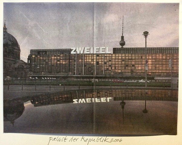 Als der Palast der Republik im Sterben stand, ausgeweidet, ausgeblutet, nur noch Stahlknochen und Haut, konnten Sie in seinen Innereien herumgehen. Es gab noch Ausstellungen mit renommierten Künstlern. Durch das fast blinde Glas konnte man noch faszinierende Fotos der Umgebung machen, vom Dom, vom Fernsehturm. Als also der Palast starb, installierte auf seiner Stirn im Januar 2006 der norwegische Künstler Lars Ramberg aus sechs Meter hohen neonbeleuchteten Buchstaben das Wort „Zweifel“. Es schien, als ob der Palast sich noch wehren wollte, als ob er uns zuriefe: „Lasst ab, denkt nach! Seid ihr sicher? Ist euch klar, was mein Tod für die Menschen bedeutet, in der Geschichte, in der Gegenwart? So wie 1950 das Schloss, das vor mir hier stand, im Krieg waidwund geschossen, sich gegen seine Sprengung gewehrt haben mag und nur wenige es hörten?“