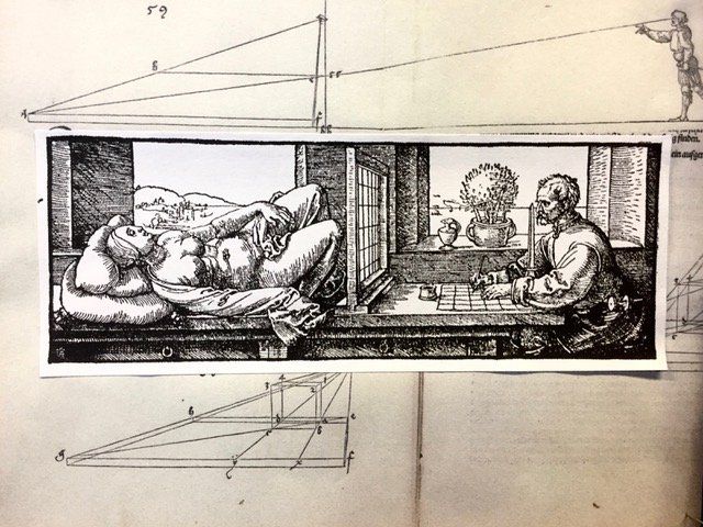 Der Polyeder auf dem Stich, der uns drei Künstler seit Jahren beschäftigt, gibt uns Rätsel auf, vor allem auf drei Fragen: 1.Woraus besteht er? 2. Wie ist er gemacht? 3. Was bedeutet er? Die erste Frage ist leicht zu beantworten: Er ist wohl aus Stein. Alle Seiten sind perfekt geschliffen. Alle Seiten? Zweifel schleichen sich ein. Wie sieht er von hinten aus? Wir wissen' s nicht. Lösungsvorschläge gibt es hier im Raum, auch bei Anselm Kiefer und anderen. Die Frage „Wie ist er gemacht?“ ist noch ernüchternder. Er ist nicht aus Stein, er ist aus Papier! Und er ist nicht mehrdimensional, sondern nur zweidimensional. Albrecht Dürer hat uns reingelegt, in die Irre geführt: Das was wir sehen ist nicht das was es vorgibt zu sein. Er hat uns mit den Mitteln der Grafik, der Architektur, der Mathematik, der Geometrie auf einer zweidimensionalen Fläche die Illusion einer räumlichen Wirklichkeit entworfen. Es ist eine Sichtweise, die wir heute als vertraut empfinden. Sie herrschte in der Kunst bis etwa zum Impressionismus vor, erst mit Cézanne, durch den Kubismus, den Expressionismus „entlarvt“.